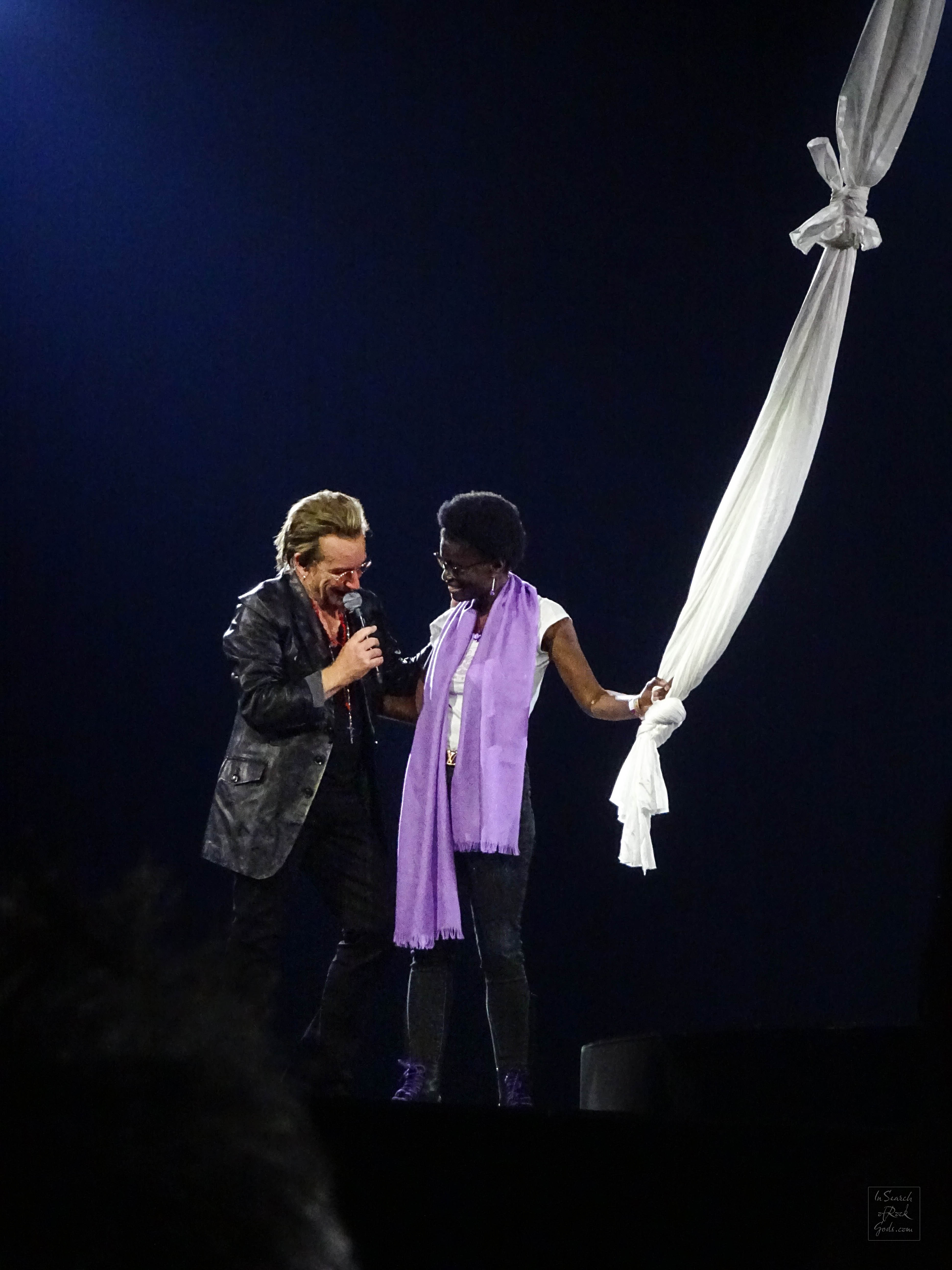 U2, my boys, walk up onto the stage to uproarious applause and screams. Our boys are here.