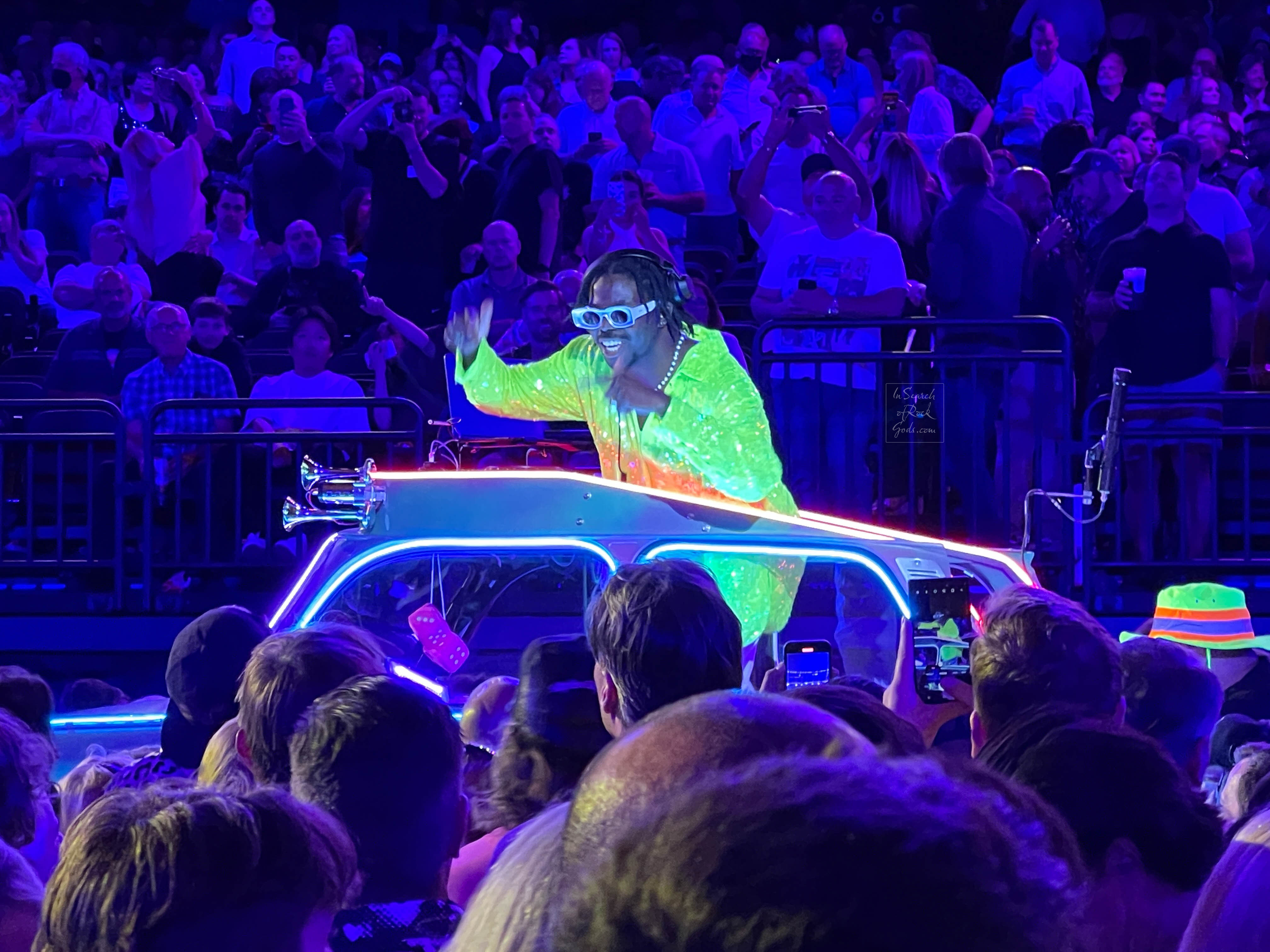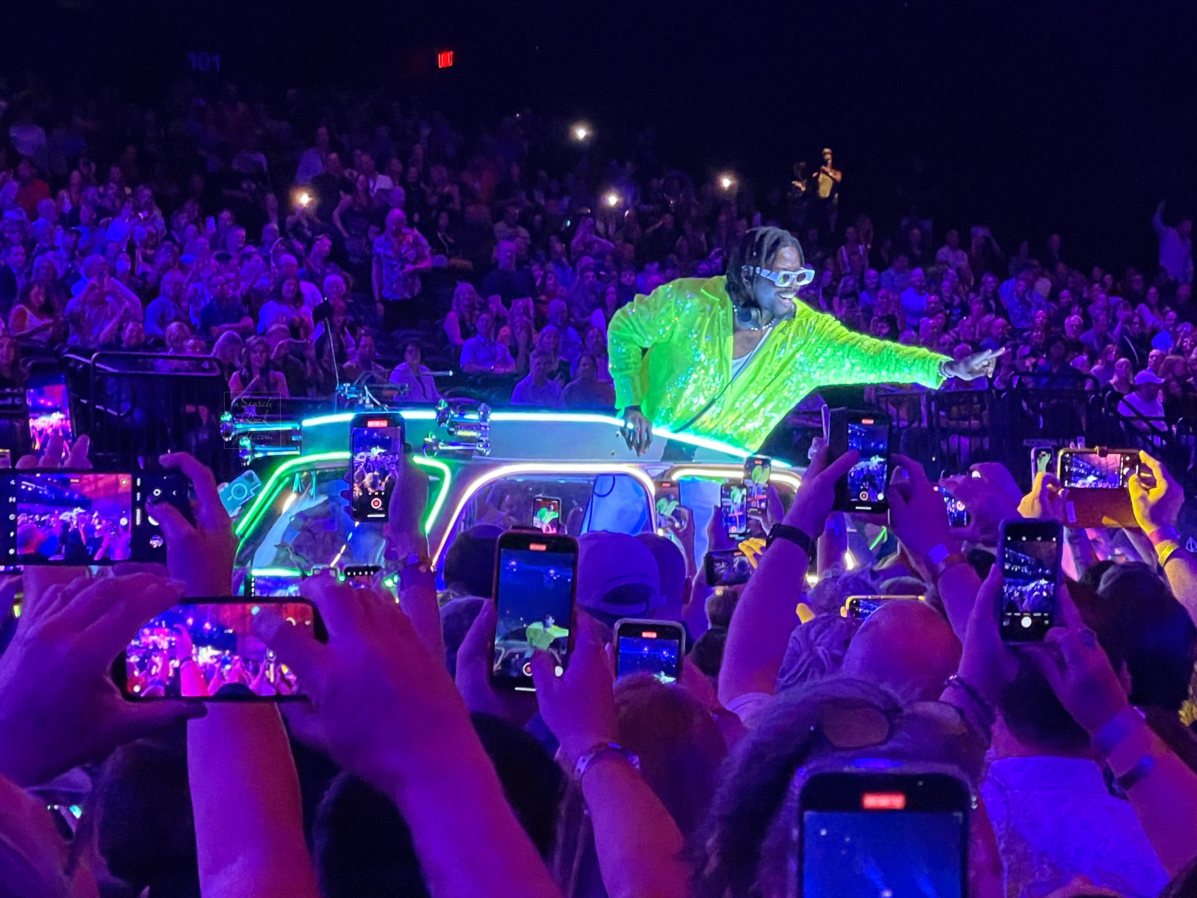 Builds as Pauli the PSM warms the crowd with a selection of 80s and 90s hits from his blacklight Trabant. Many of us wearing glow sticks and UV makeup. (It tickles me to no end that my first rave-like experience is weeks before my 50th birthday at a U2 concert :P. Age means nothing – music means everything.) (Side note, because this also tickles me – Pauli was the percussionist and musical director for Harry Styles’ Love on Tour.)