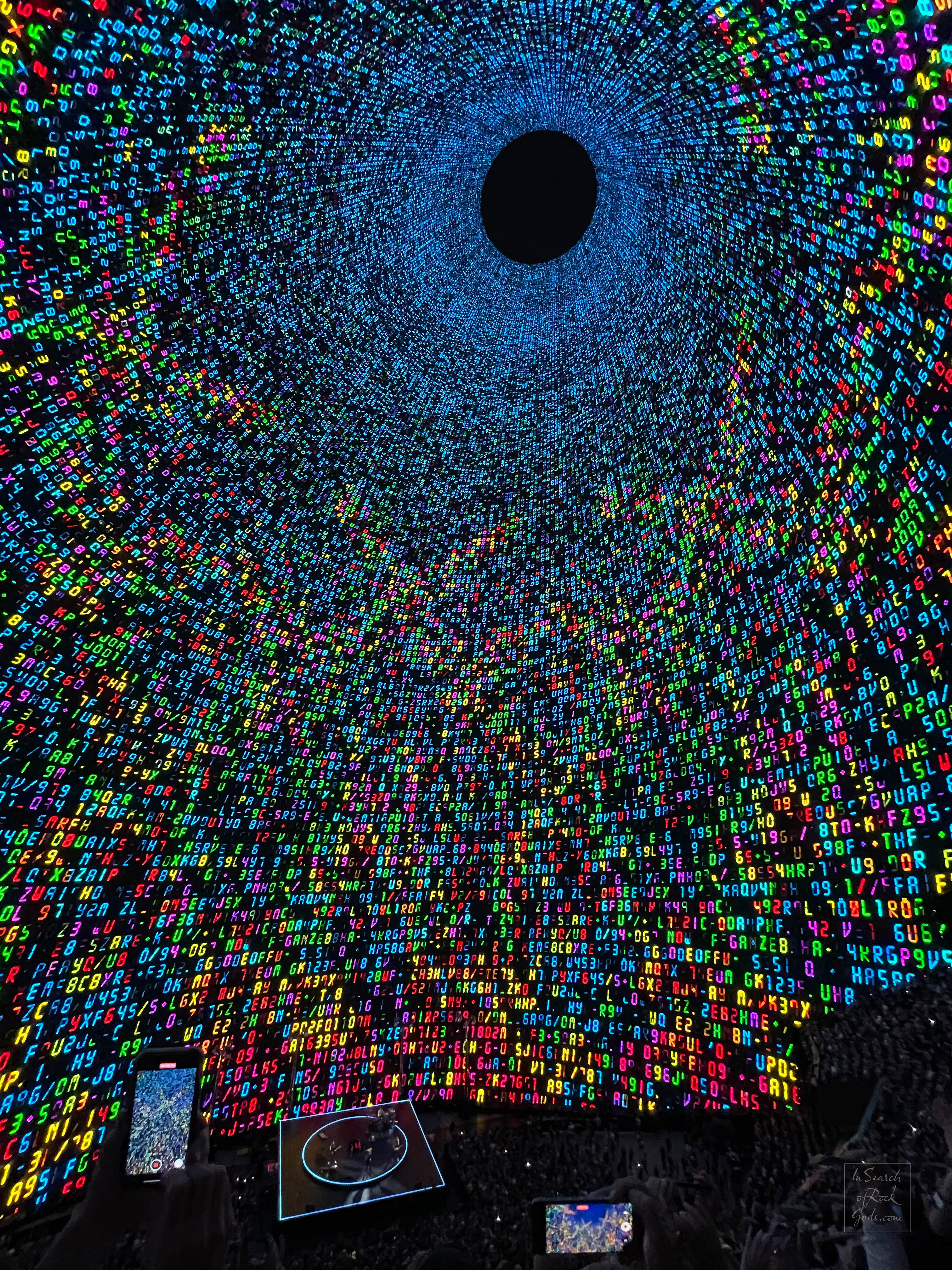 The full impact of the 360 screen (or whatever, it doesn’t really go all the way around, it stops at the audience, but still) isn’t really experienced from the floor, either right at the stage or in the middle, at least not without effort. You have to crick your neck up to see it above or turn around to see it behind you, which does work, it just doesn’t allow the whole experience. The screen is best experienced further up and centre. I’m not sure if there’s a difference between sitting in 305, vs 205 or 405, but 305 was damn cool!